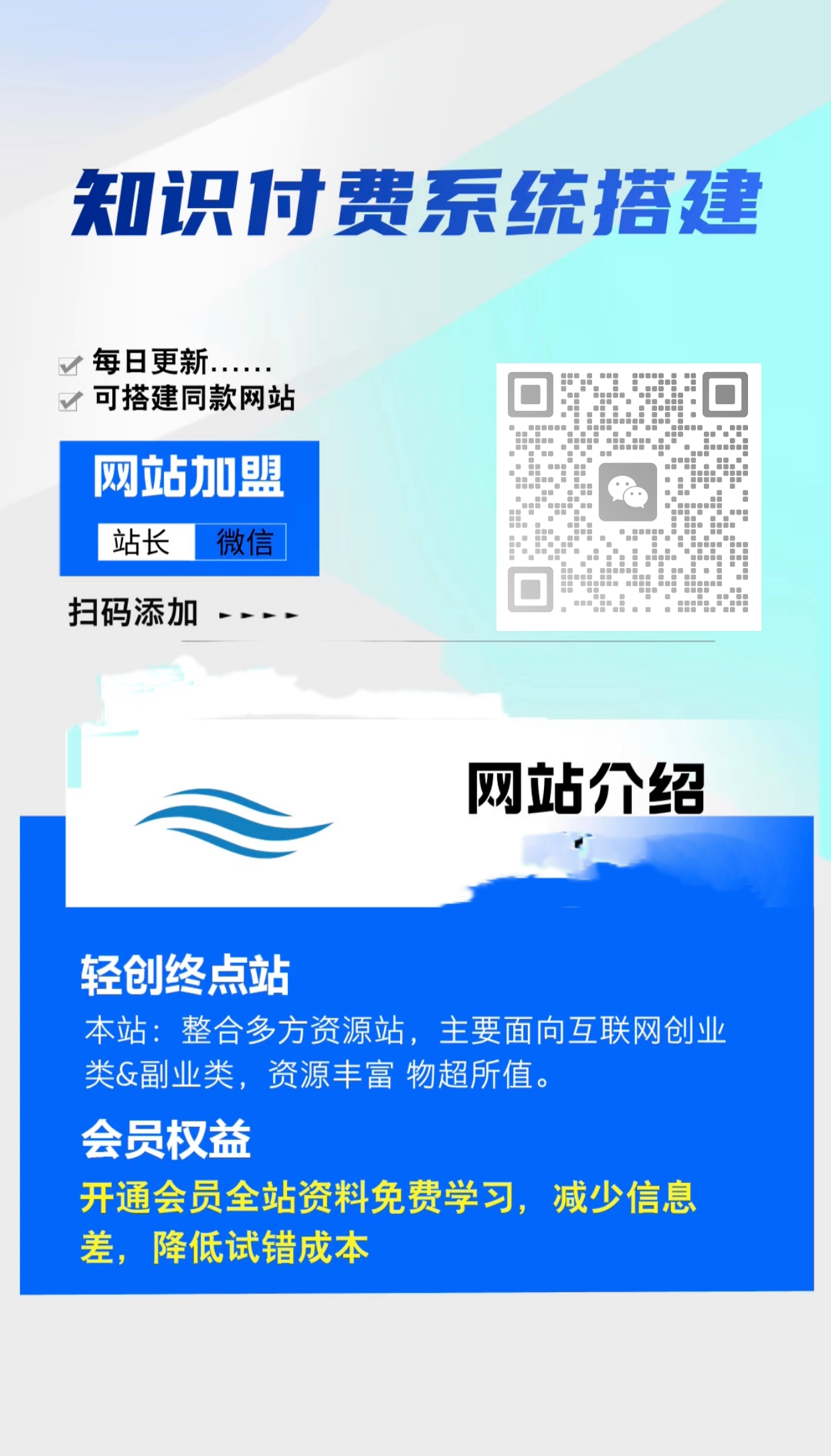 加盟轻创终点站,加盟搭建同款知识付费资源网站,实现长期稳定被动收入~